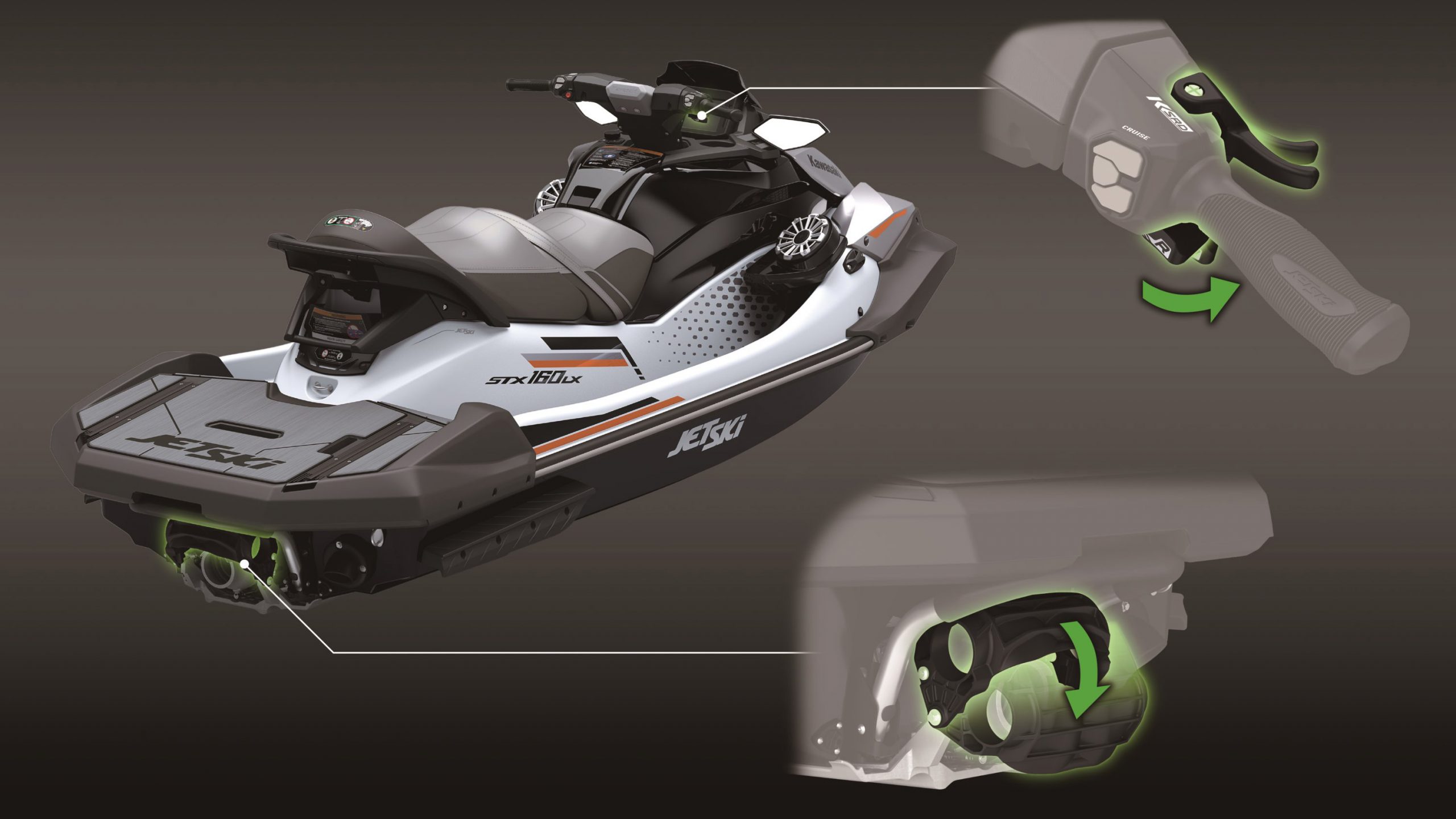 The reverse trigger on the 2026 Kawasaki STX 160 is the same two-in-one design that debuted on the latest generation Kawasaki Ultra series introduced in 2022.